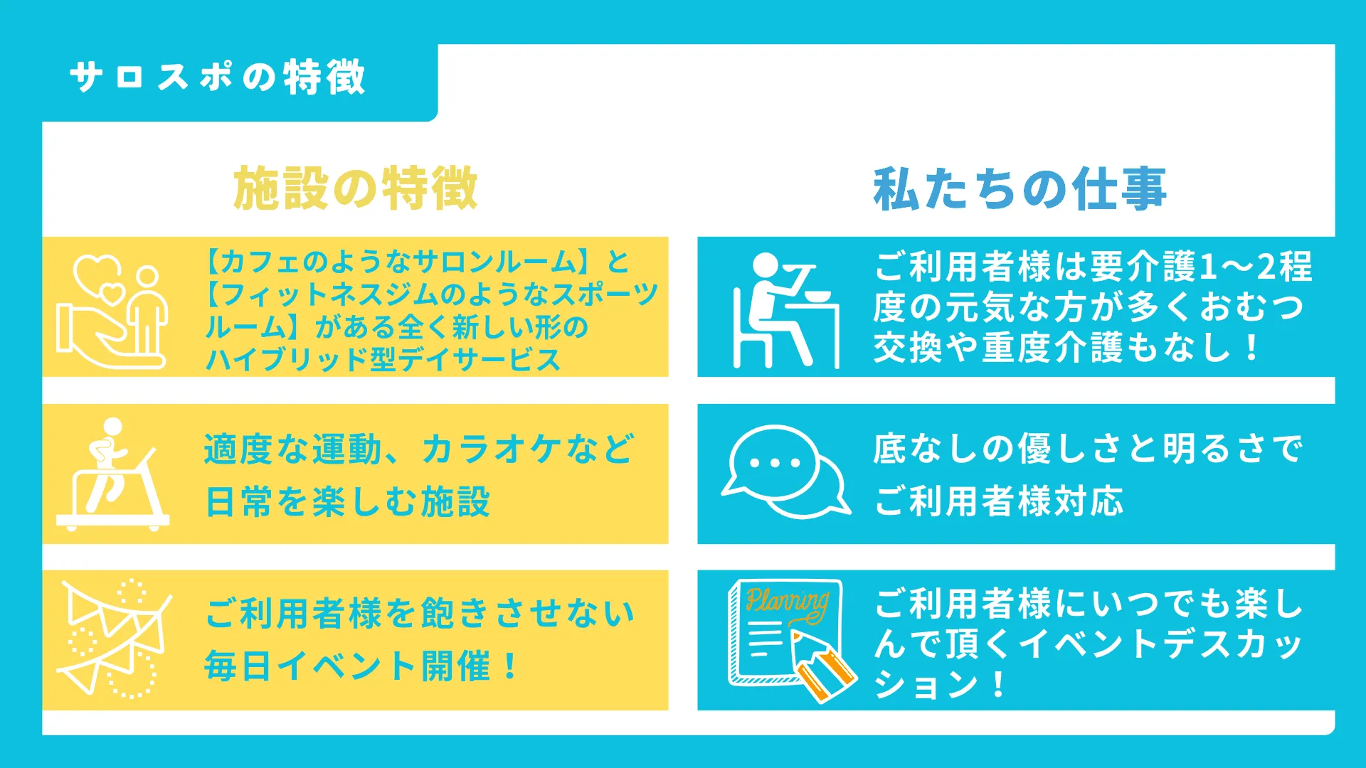 また、私の事を推してくれているご利用者様がいるのですが、その存在も嬉しいですね。「推してくれている=元気をもらえる存在」と思ってもらえていることは、私のモットーがご利用者様に伝わっている証明でもあり、私にとってサロスポは最適な環境で働けています。