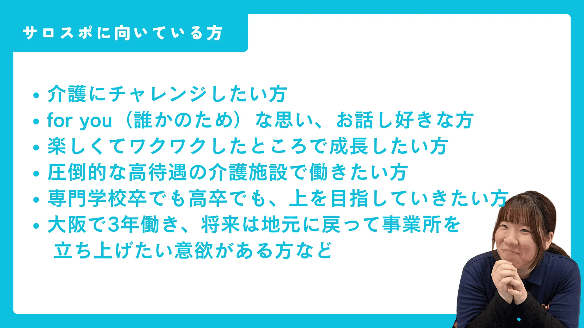 多数のご利用者様とかかわり、楽しいイベントづくりをしたりお話する仕事なので、人に向き合い、感謝されることにやりがいを持った経験があれば大丈夫!