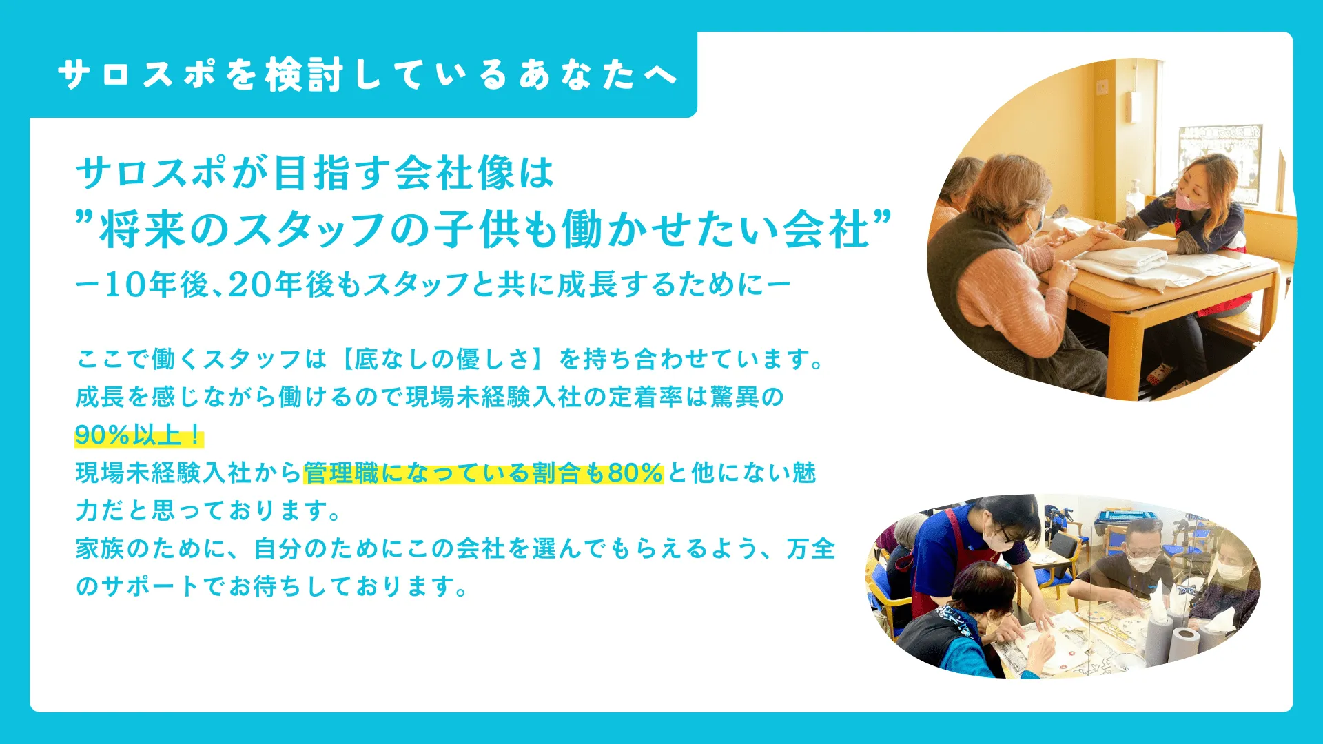 楽しんで仕事をすることで、自分も利用者様も笑顔になれます。一緒に楽しく働きましょう!