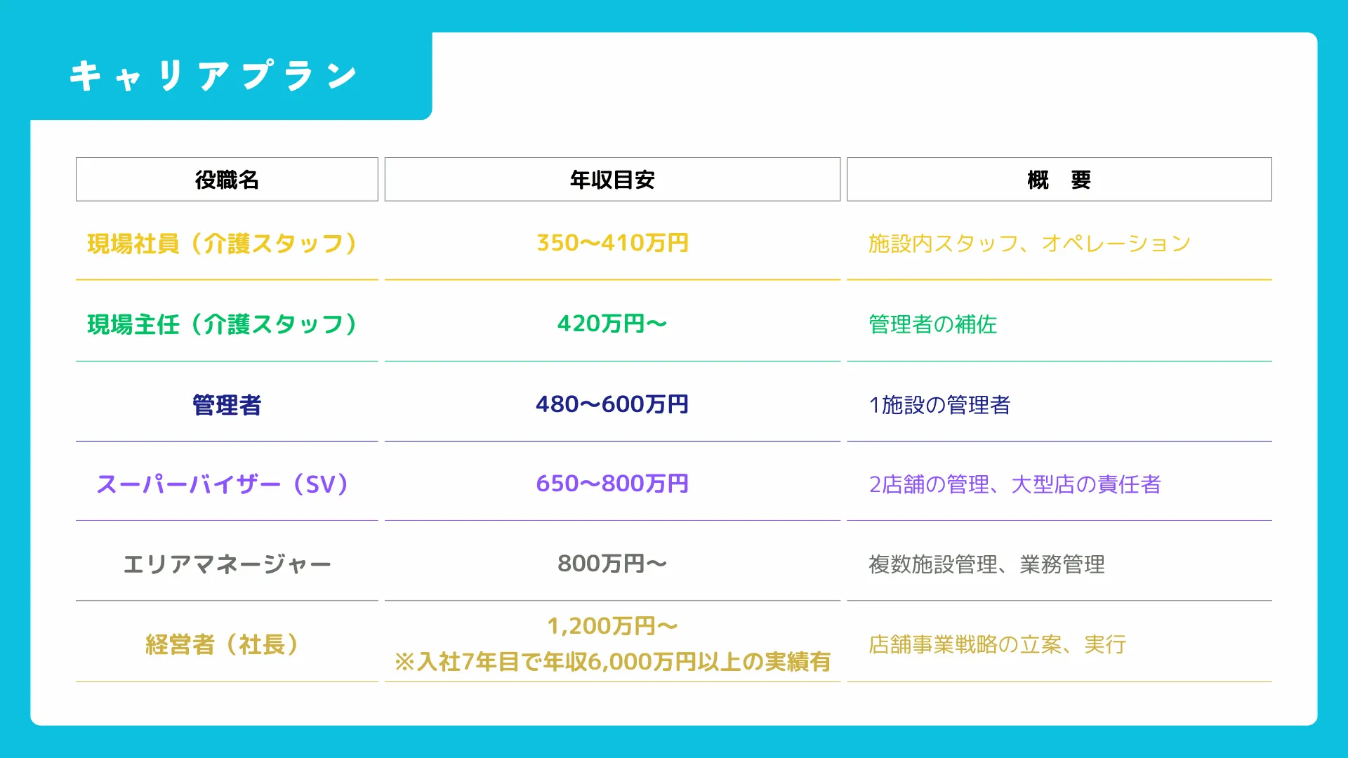毎年新規出店をしているため、目指したいポストに就くチャンスは何度でもあります。現場のスキルを高めたい方も、上を目指したい方も、一人ひとりのキャリアを応援します。