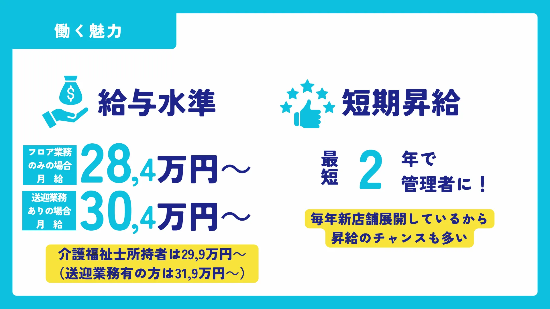働きながら介護福祉士資格を取得すると毎月1,5万円、年間18万円の年収UPに!成長に合わせてしっかり給与や昇給に還元されます。