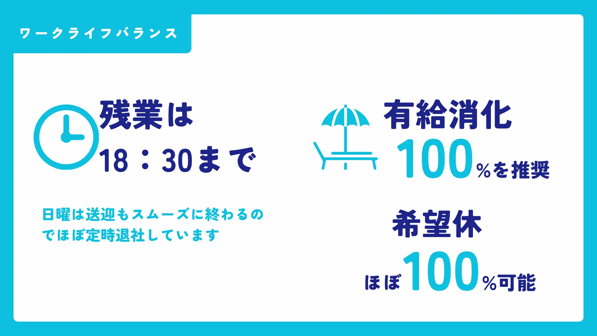 「早く帰ってしっかり休もう」をスローガンとし、無駄な残業は一切なし!もちろん、休日出勤もありません!