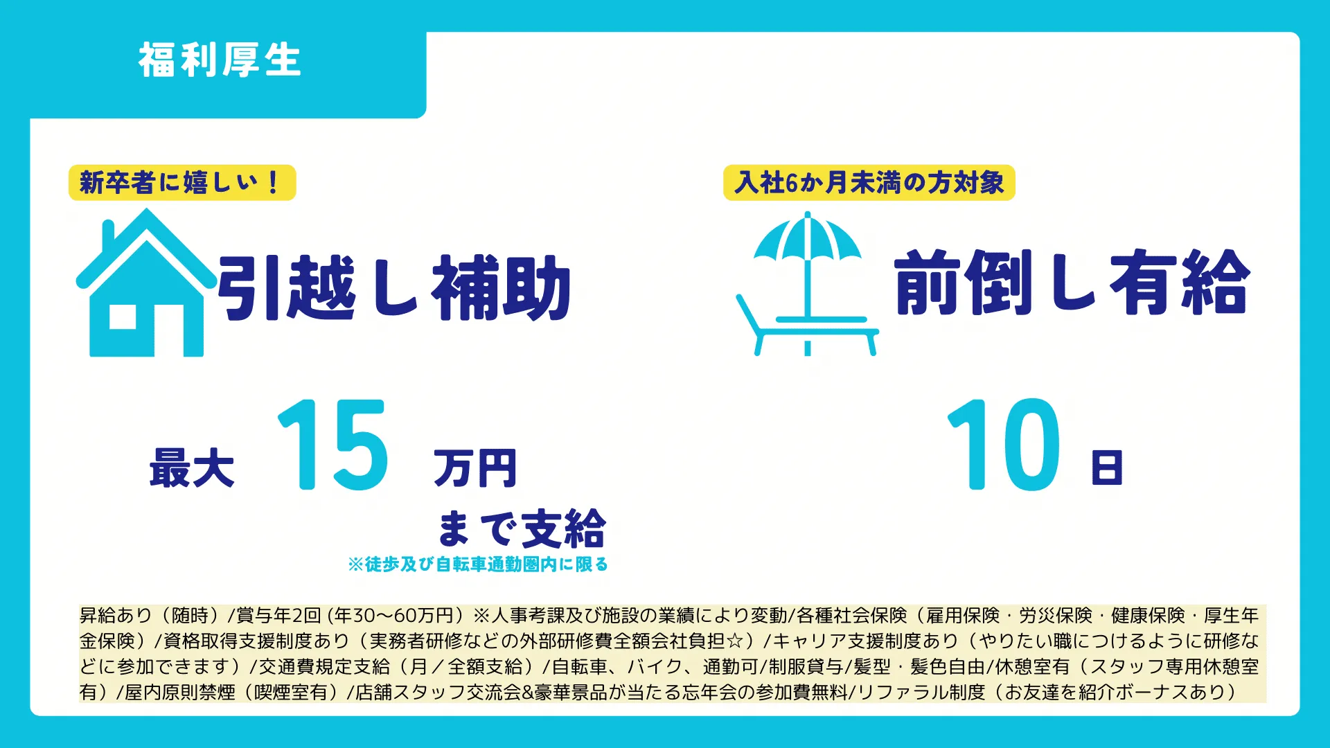 ご希望の方には、入社6ヶ月間に前倒しで最大10日間まで有給休暇取得可能です。(連休も可能)